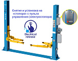 Гарантия 36 мес – наш монтаж, 24 мес – самостоятельная установка. Верхняя синхронизация (чистый пол). Ограничитель подъёма при достижении максимальной высоты. Высота от пола до ограничительной планки 3442 мм. Съем со стопоров ручкой на одной колонне (экономия времени). Увеличена толщина каретки до 8 мм. Поднимает все легковые+Джипы (h=110÷1825 мм). Между колоннами 2800 мм. 220/380В. г/п. 4 тонны.