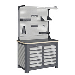 Нагрузка на столешницу 1500 кг. Столешница из листа влагостойкой фанеры марки ФСФ толщиной 40 мм и листом горячекатаной стали толщиной 5 мм. Рама верстака выполнена их холоднокатаной стали. Модуль верстака выполнен сварными. Ящики в модулях устанавливаются на шариковых телескопических направляющих полного выдвижения. Квадратная перфорация для установки крючков, держателей. Размеры: 1982x1193x743 мм