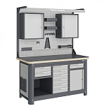 Нагрузка на столешницу 1500 кг. Столешница из листа влагостойкой фанеры марки ФСФ толщиной 40 мм и листом горячекатаной стали толщиной 5 мм. Рама верстака выполнена их холоднокатаной стали. Модуль верстака выполнен сварными. Ящики в модулях устанавливаются на шариковых телескопических направляющих полного выдвижения. Квадратная перфорация для установки крючков, держателей. Размеры: 1982x1993x743 мм.
