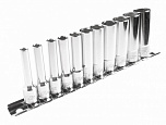Головки изготовлены из закаленной хром-ванадиевой стали. Полированная поверхность. В набор входит планка крепления и хранения головок.Набор 9 предметов (Е10, Е11, Е12, Е14, Е14, Е16, Е18, Е20, Е22, Е24).