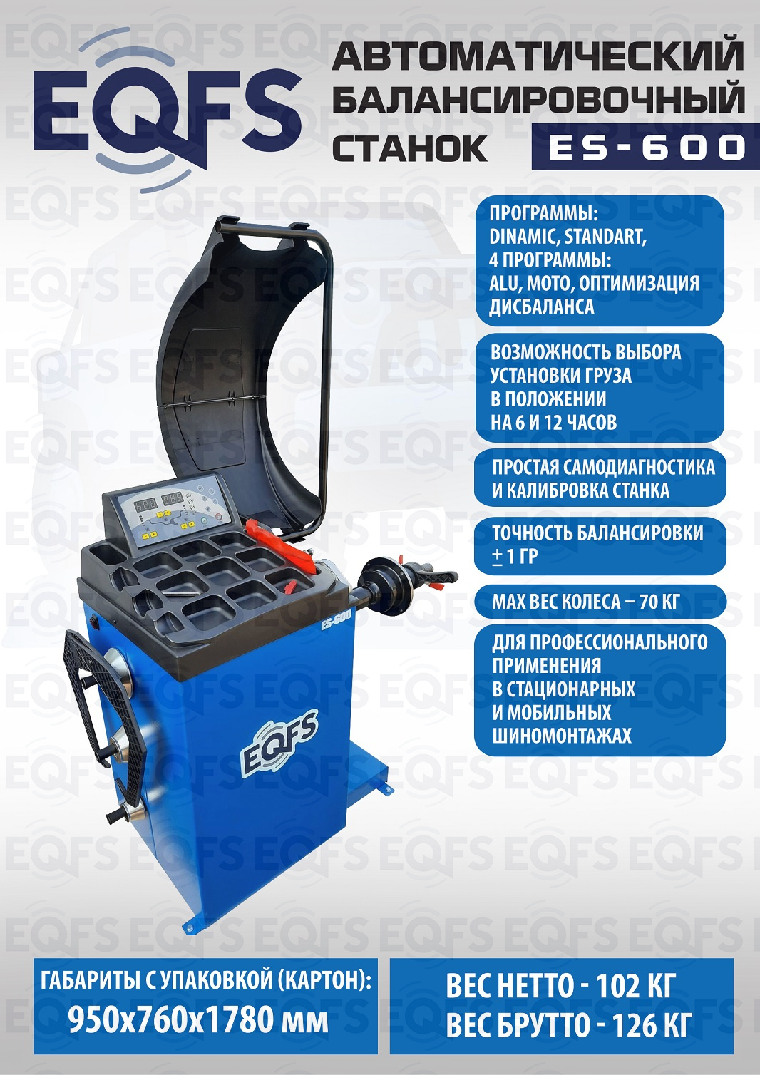 ES-600 Балансировочный станок. Автомат. Для колес легковых автомобилей, мотоциклов и легких грузовиков с диаметром диска с резиной до 800 мм. Размеры диска: ширина 3–10” (76-254 мм), диаметр диска 10–24” (254÷609 мм). Вал- 40мм. Гарантия 18 мес – наш монтаж, 12 мес – самостоятельная установка. В комплекте: кожух с автозапуском + клещи + кронциркуль + быстрозажимная гайка + набор конусов.