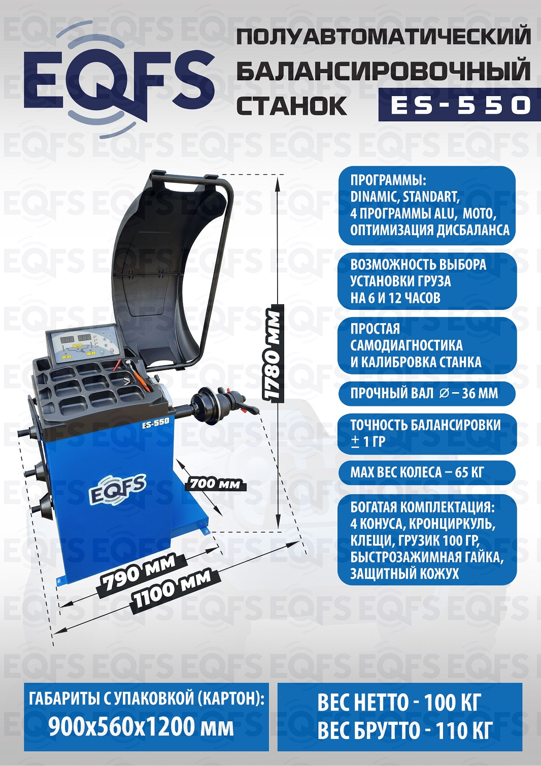 ES-550 Балансировочный стенд. Полуавтомат. Удобный и понятный интерфейс. Автозапуск опусканием кожуха. Автоматический ввод дистанции и диаметра диска. Лазерная навигация. Автокалибровка. Для колес легковых автомобилей, мотоциклов, «Газелей», «Спринтеров» с диаметром диска с резиной до 800 мм. Размеры диска: ширина 3–10” (76-254 мм) , диаметр диска 10–24” (254÷609 мм). Вес ≤ 65 кг. Вал- 36 мм. Точность ±1гр. 220 В. Режимы работы DINAMIC, STATIC, ALU1, ALU2, ALU3, ALUS, ST. Гарантия 12 мес.