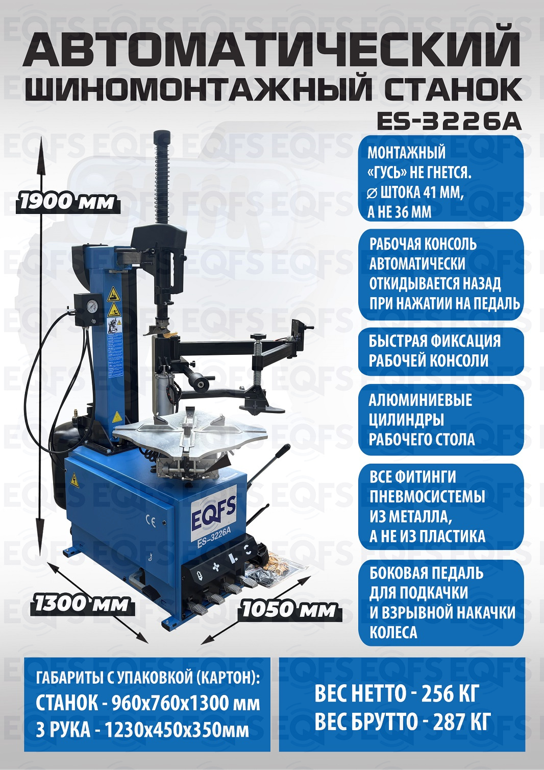 ES-3226A Надёжный шиномонтажный станок - рекомендуем. Автомат. В комплекте взрывная подкачка + «третья рука» для работы с низкопрофильными шинами и RanFlat. Все быстросъемные элементы пневмосистемы выполнены из металла, а не из пластика, что уменьшает вероятность поломки! Внешний зажим 11-21”. Внутренний зажим 12-24”. Для покрышек легковых автомобилей, внедорожников, «Спринтеров», «Газелей» и т.п.