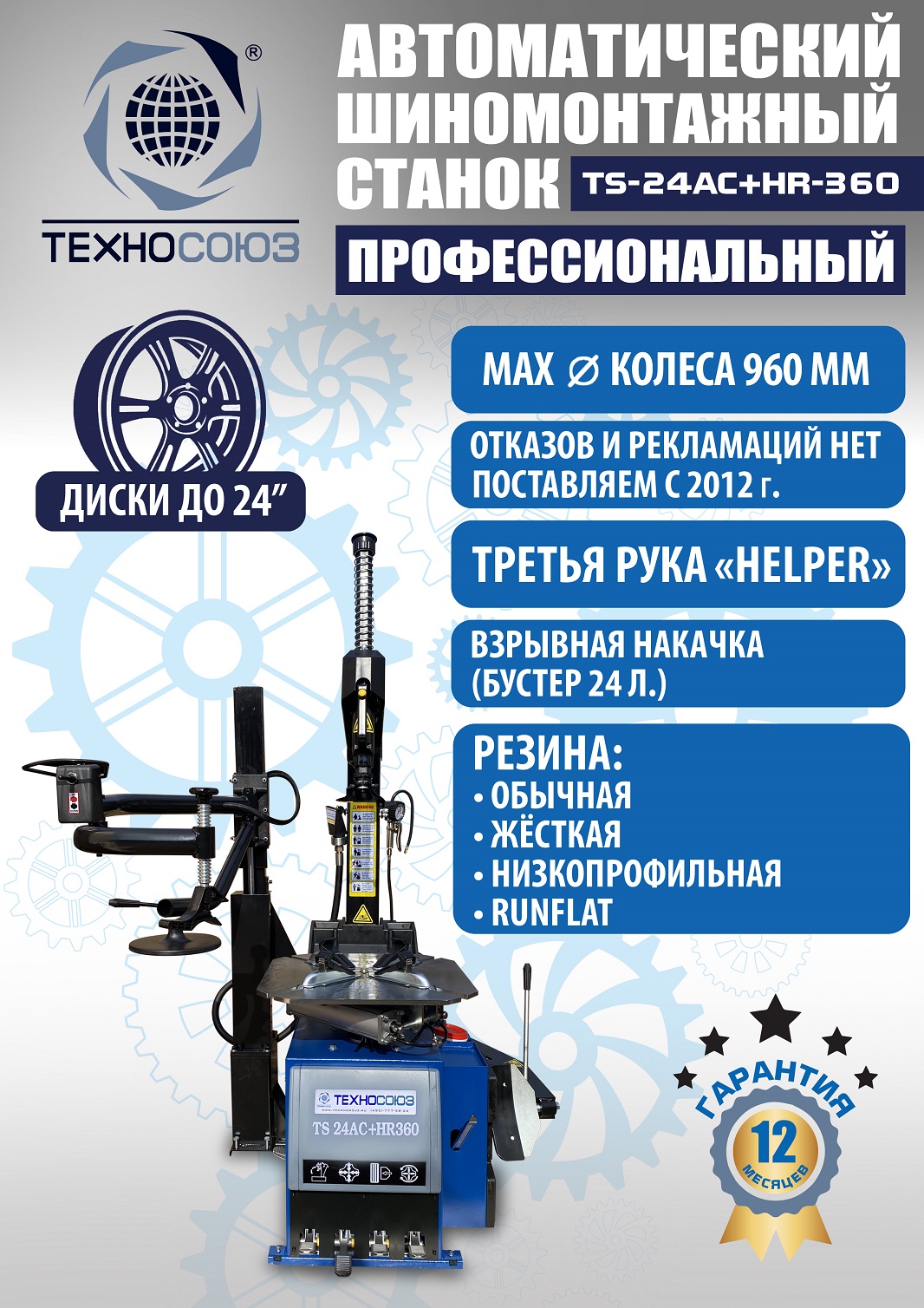 Автоматического шиномонтажного стенда TS-24AC+HR-360 Для дисков: внешний 10÷21”, внутренний 12÷24”. В комплекте взрывная подкачка + третья рука для работы с низкопрофильными шинами и RanFlat! Для колес легковых автомобилей, легких грузовиков, микроавтобусов и коммерческой техники. Напряжение 220/380В. Гарантия 18 мес. – наш монтаж, 12 мес. – самостоятельная установка.
