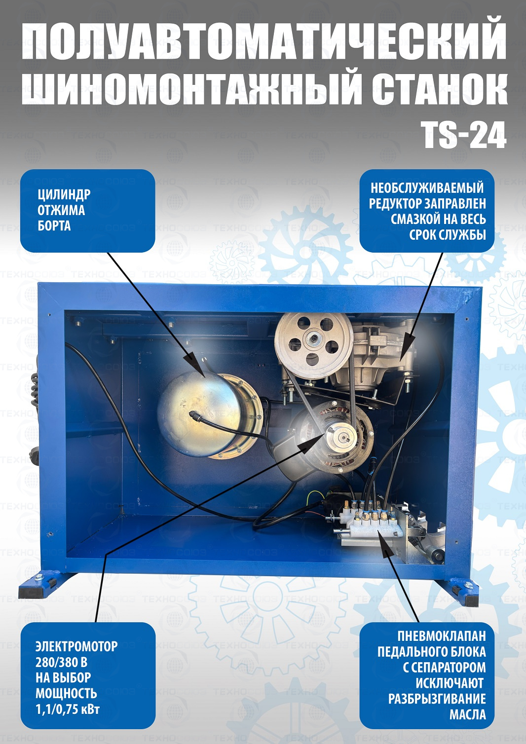 Шиномонтажного станка TS-24. Полуавтоматический. Квадратный стол. Рекомендуется для постов со средней и высокой проходимостью. Для дисков: внешний 11÷21”, внутренний 12÷24”.  Усилие отрыва покрышки 2700 кг. В комплекте: пистолет для подкачки шин + монтажка + пластиковые накладки на зажимные кулачки + регулятор давления с влагоотделителем и манометром. Напряжение шиномонтажных станков 220В или 380В на выбор.