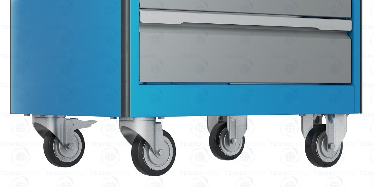 Все металлические элементы тележки покрыты полиэфирной порошковой краской, обеспечивающей хорошую износостойкость покрытия и стойкость его к моющим средствам и смазочным веществам. Цвет и текстура покрытия корпуса тележки RAL 5015, полуматовое. Цвет и текстура покрытия ящиков тележки RAL 7037, глянцевое. Цвет и текстура покрытия накладок на ящики RAL 9006, глянцевое.  На крыше тележки установлен формованный лоток, выполненный из АБС-пластика толщиной 2 мм. В лотке имеется одно большое основное отделение и три малых отделения для хранения метизов и небольшого инструмента.  Тележка снабжена центральным замком с поворотом ригеля 180 градусов, который закрывает одновременно все ящики. Замок неподвижно и прочно закреплен на корпусе тележки. В комплекте имеется два ключа. Тяга замка подпружинена.