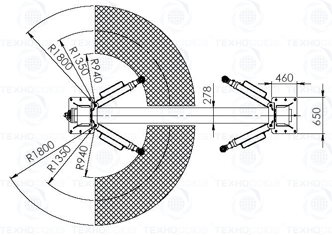 Симметричный двухстоечный автосервисный подъемник с нижней синхронизацией  грузоподъемность 6,0 т. с ручными / электрическими стопорами. Предназначен для подъема коммерческих автомобилей, бронированных автомобилей, автомобилей с длиной базой типа Мерседес Спринтер, Пежо Боксер и т.п.при комплектации удлиненными лапами 940-1800мм.